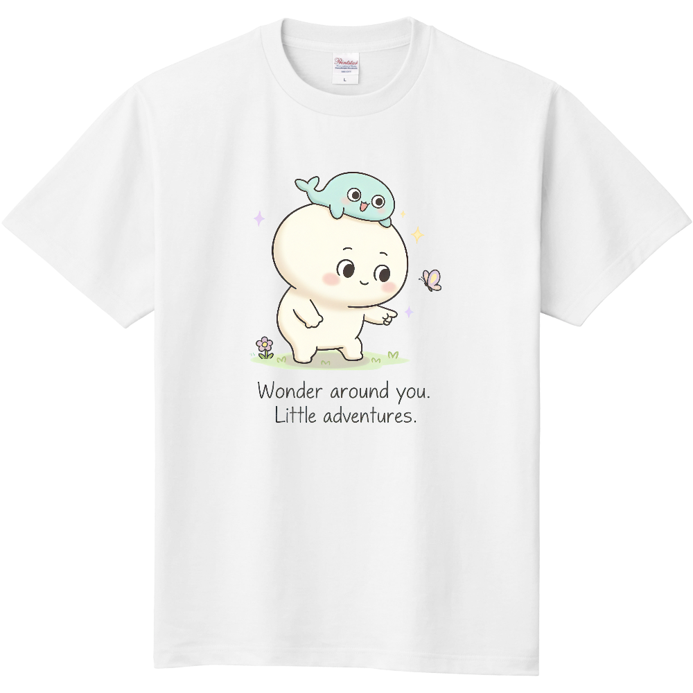 デザインの特徴は、キャラクターと頭の上の小さな仲間が、何かを指差して驚いたり、目を輝かせたりしている表情を描いています。