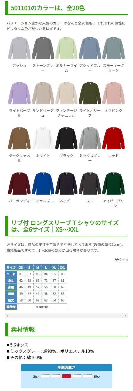 ・リブ付 ロングスリーブTシャツのサイズは、全6サイズ|XS~XXL