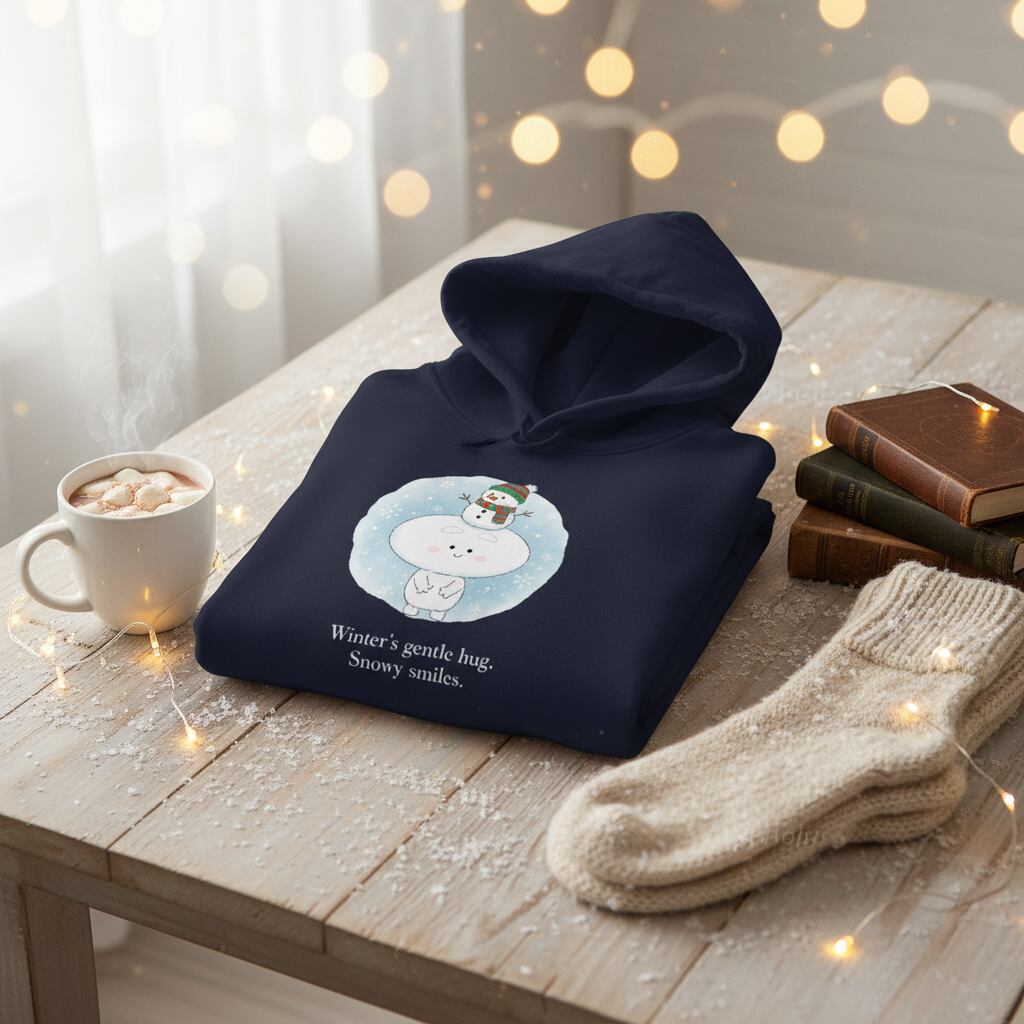 メッセージは「Winter's gentle hug.」(冬の優しい抱擁)や「Snowy smiles.」(雪のような微笑み)など、冬の季節感や温かい気持ちを表現する言葉を添えています。